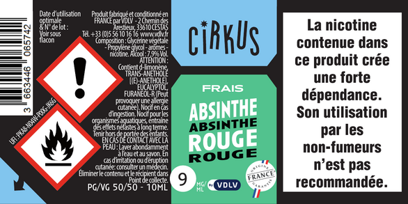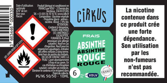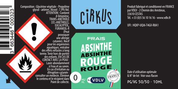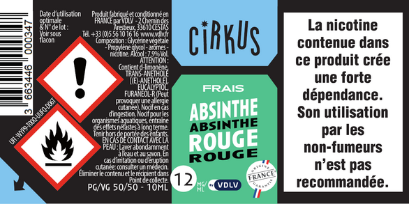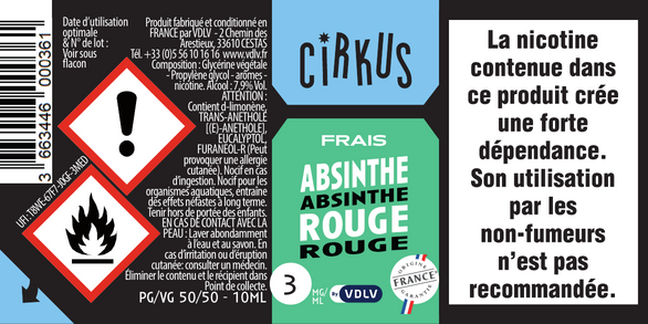 Absinthe Rouge est un e-liquide pour cigarette électronique, de la marque Cirkus disponible en 0, 3, 6, 12 et 16mg/ml de nicotine et un taux de PG/VG de 50/50. Cette saveur est disponible en 10ml et en 50ml à booster.