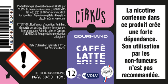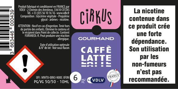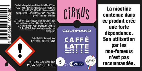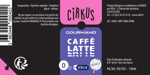 Caffe LAtte est un e-liquide pour cigarette électronique, de la marque Cirkus disponible en 0, 3, 6, 12 et 16mg/ml de nicotine et un taux de PG/VG de 50/50. Cette saveur est uniquement disponible en 10ml.