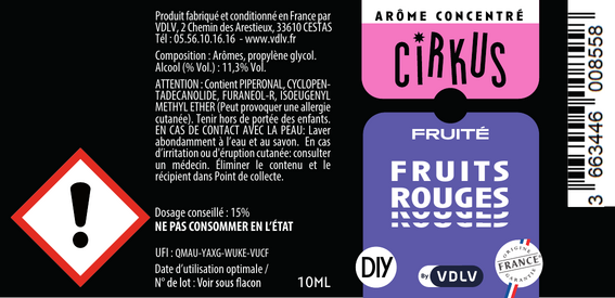 L'étiquetage : conformément à la législation européenne, chaque flacon présente un étiquetage personnalisé mentionnant le dessin et le nom de la saveur, la composition de l'arôme concentré, le nom, l'adresse et le site e-commerce de la société, la date limite d'utilisation et le numéro de lot.