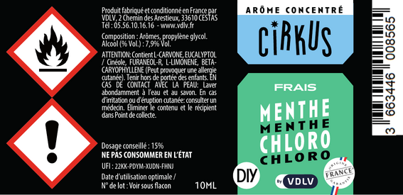 L'étiquetage : conformément à la législation européenne, chaque flacon présente un étiquetage personnalisé mentionnant le dessin et le nom de la saveur, la composition de l'arôme concentré, le nom, l'adresse et le site e-commerce de la société, la date limite d'utilisation et le numéro de lot.
