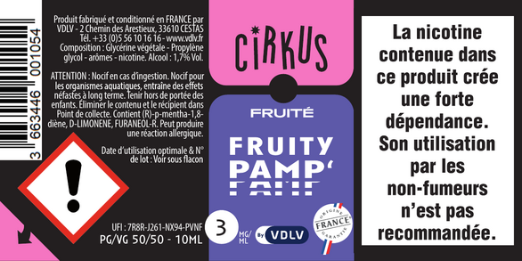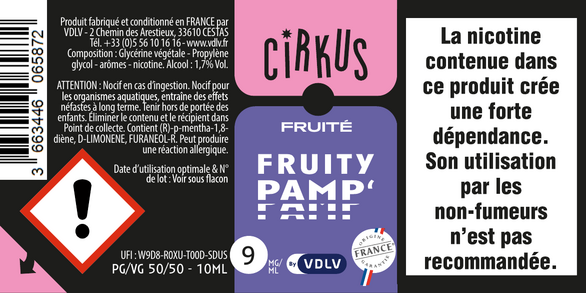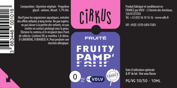 Fruity Pamp' est un e-liquide pour cigarette électronique, de la marque Cirkus disponible en 0, 3, 6, 12 et 16mg/ml de nicotine et un taux de PG/VG de 50/50. Cette saveur est uniquement disponible en 10ml.