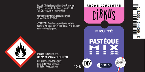 L'étiquetage : conformément à la législation européenne, chaque flacon présente un étiquetage personnalisé mentionnant le dessin et le nom de la saveur, la composition de l'arôme concentré, le nom, l'adresse et le site e-commerce de la société, la date limite d'utilisation et le numéro de lot.