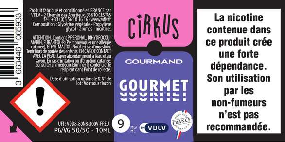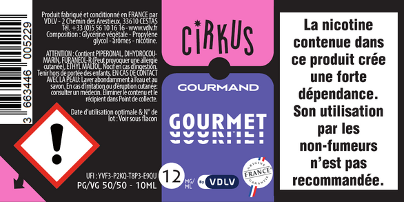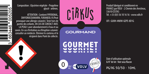 L'étiquetage : conformément à la législation européenne, chaque flacon présente un étiquetage personnalisé mentionnant le dessin et le nom de la saveur, la composition du e-liquide, le taux de nicotine, le nom, l'adresse et le site e-commerce de la société, la date limite d'utilisation et le numéro de lot. Pour les e-liquides nicotinés, un pictogramme réglementaire, des conseils de prudence ainsi qu'un triangle tactile "danger" pour les personnes malvoyantes sont placés sur l'étiquette du flacon.