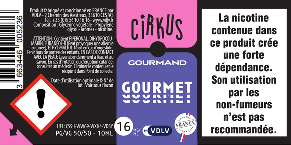 Gourmet 3mg/ml + 6mg/ml + 12mg/ml + 16mg/ml : Dangereux. Respecter les précautions d'emploi.
