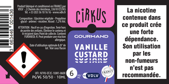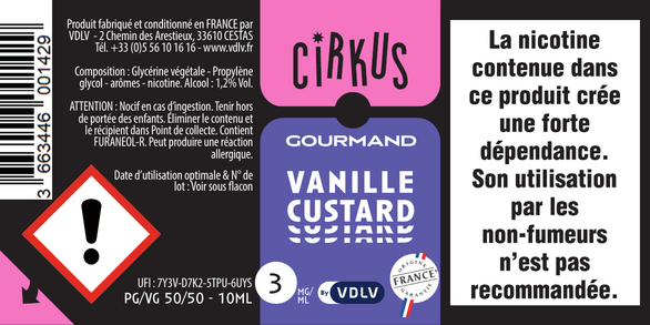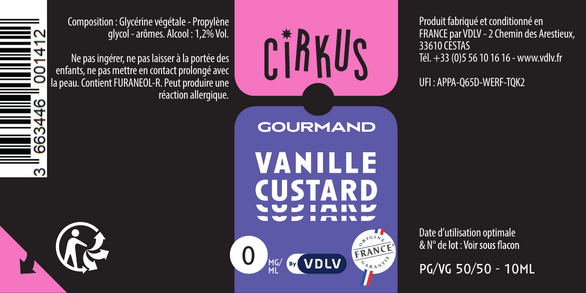 Vanille Custard est un e-liquide pour cigarette électronique, de la marque Cirkus disponible en 0, 3, 6, 12 et 16mg/ml de nicotine et un taux de PG/VG de 50/50. Cette saveur est uniquement disponible en 10ml.