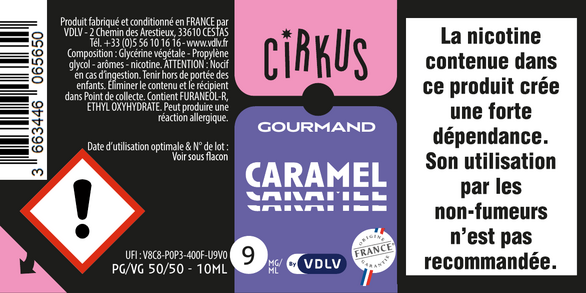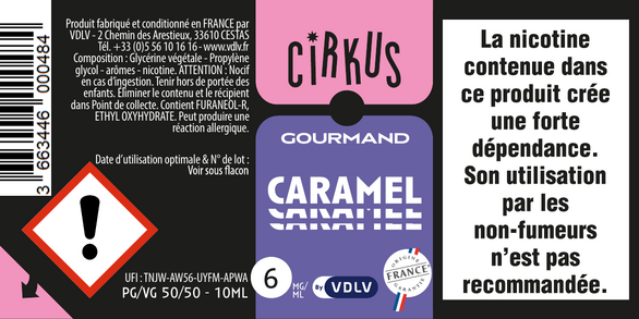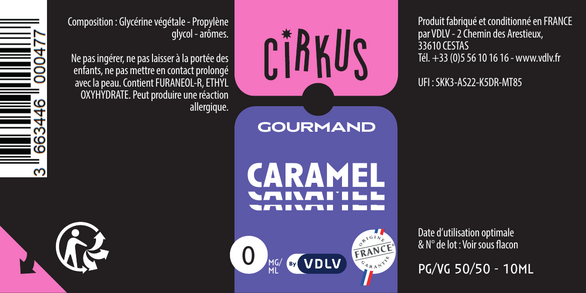 Caramel est un e-liquide pour cigarette électronique, de la marque Cirkus disponible en 0, 3, 6, 12 et 16mg/ml de nicotine et un taux de PG/VG de 50/50. Cette saveur est disponible en 10ml et en 50ml à booster.