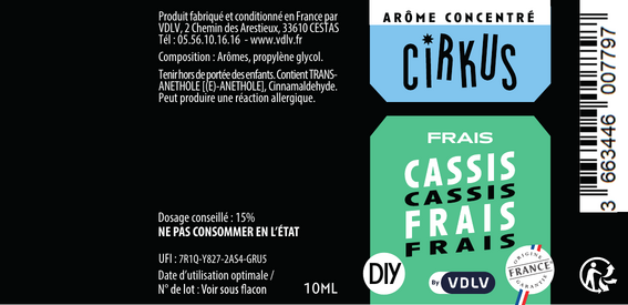 L'étiquetage : conformément à la législation européenne, chaque flacon présente un étiquetage personnalisé mentionnant le dessin et le nom de la saveur, la composition de l'arôme concentré, le nom, l'adresse et le site e-commerce de la société, la date limite d'utilisation et le numéro de lot.