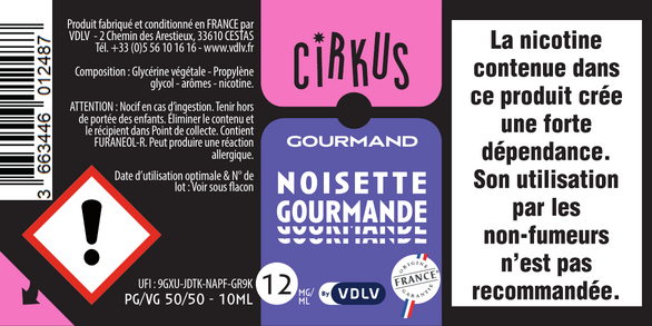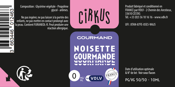 Noisette Gourmande est un e-liquide pour cigarette électronique, de la marque Cirkus disponible en 0, 3, 6, 12 et 16mg/ml de nicotine et un taux de PG/VG de 50/50. Cette saveur est uniquement disponible en 10ml.