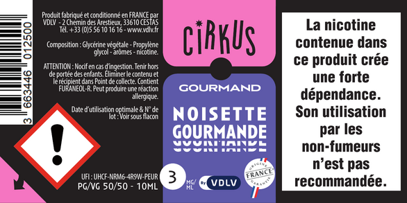 L'étiquetage : conformément à la législation européenne, chaque flacon présente un étiquetage personnalisé mentionnant le dessin et le nom de la saveur, la composition du e-liquide, le taux de nicotine, le nom, l'adresse et le site e-commerce de la société, la date limite d'utilisation et le numéro de lot. Pour les e-liquides nicotinés, un pictogramme réglementaire, des conseils de prudence ainsi qu'un triangle tactile "danger" pour les personnes malvoyantes sont placés sur l'étiquette du flacon.