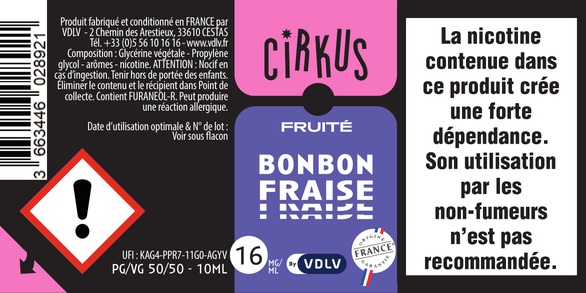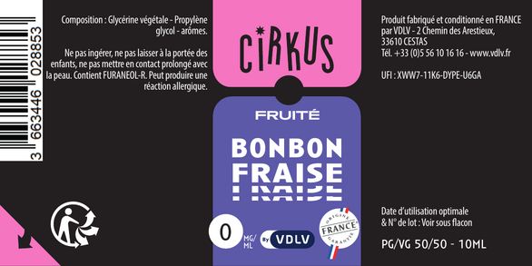 Bonbon Fraise est un e-liquide pour cigarette électronique, de la marque Cirkus disponible en 0, 3, 6, 12 et 16mg/ml de nicotine et un taux de PG/VG de 50/50. Cette saveur est uniquement disponible en 10ml.