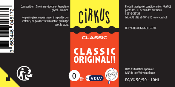 Classic Original est un e-liquide pour cigarette électronique, de la marque Cirkus disponible en 0, 3, 6, 12 et 16mg/ml de nicotine et un taux de PG/VG de 50/50. Cette saveur est uniquement disponible en 10ml