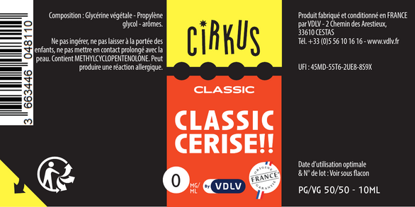 Classic Cerise est un e-liquide pour cigarette électronique, de la marque Cirkus disponible en 0, 3, 6, 12 et 16mg/ml de nicotine et un taux de PG/VG de 50/50. Cette saveur est uniquement disponible en 10ml.