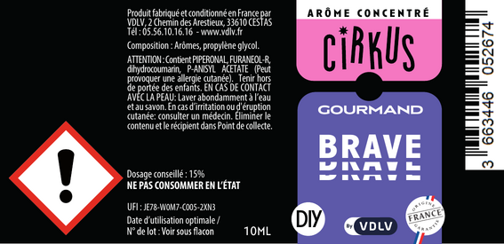 L'étiquetage : conformément à la législation européenne, chaque flacon présente un étiquetage personnalisé mentionnant le dessin et le nom de la saveur, la composition de l'arôme concentré, le nom, l'adresse et le site e-commerce de la société, la date limite d'utilisation et le numéro de lot.