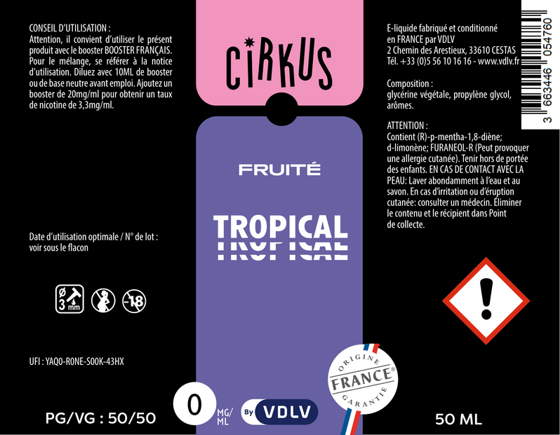 Les e-liquides 50ml Cirkus sont sans nicotine, boostés en arômes et conditionnés en flacons de 70ml pour que vous puissiez venir les compléter avec un Booster Français afin d'obtenir un taux de nicotine de 3,33mg/ml en grand format.