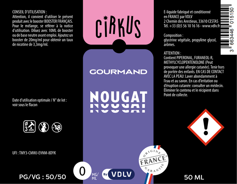 Les e-liquides 50ml Cirkus sont sans nicotine, boostés en arômes et conditionnés en flacons de 70ml pour que vous puissiez venir les compléter avec un Booster Français afin d'obtenir un taux de nicotine de 3,33mg/ml en grand format.