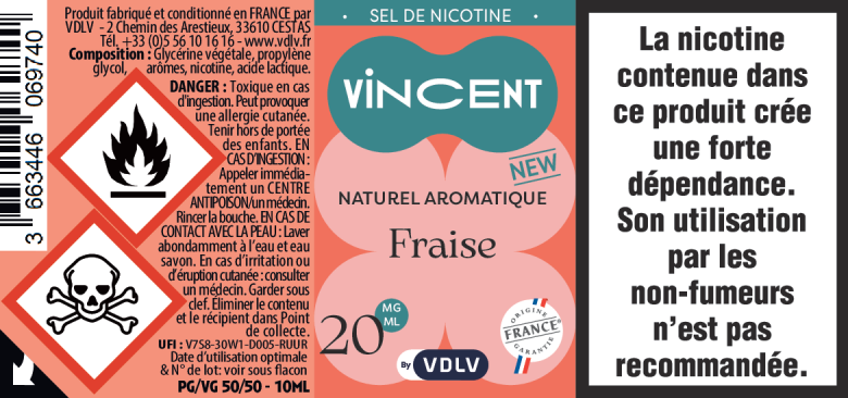 Comme tous les produits VDLV, nos e-liquides aux sels de nicotine Vincent sont fabriqués en France. La nicotine vapologique que nous utilisons est issue de feuilles de tabac cultivées localement, assurant une traçabilité et une qualité optimales.