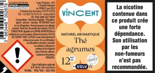 THÉ AGRUMES est un e-liquide pour cigarette électronique, de la marque Vincent disponible en 0, 3, 6, 12mg/ml de nicotine et un taux de PG/VG de 50/50. Cette saveur est uniquement disponible en 10ml