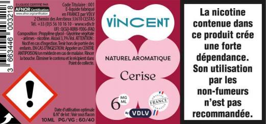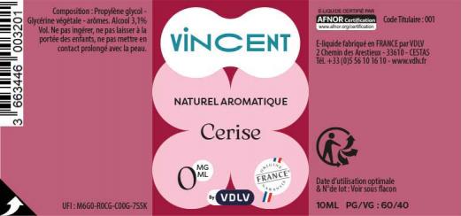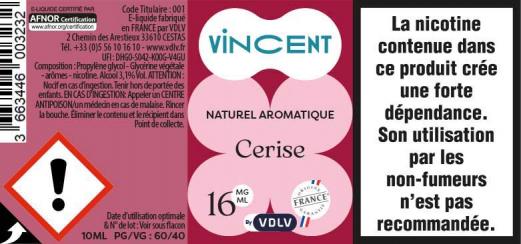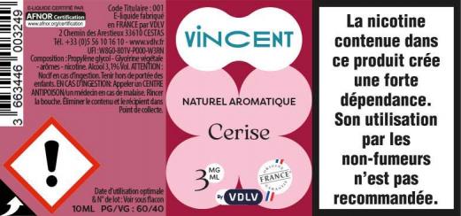 Cerise est un e-liquide pour cigarette électronique, de la marque Vincent disponible en 0, 3, 6, 12 et 16mg/ml de nicotine et un taux de PG/VG de 60/40. Cette saveur est uniquement disponible en 10ml