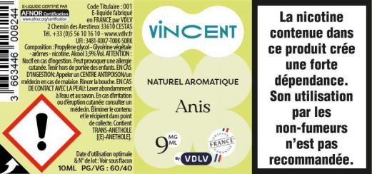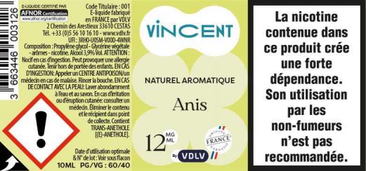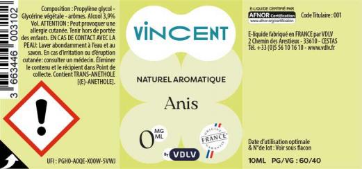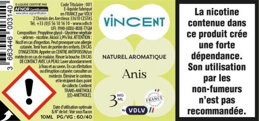 ANIS est un e-liquide pour cigarette électronique, de la marque Vincent disponible en 0, 3, 6, 12 et 16mg/ml de nicotine et un taux de PG/VG de 60/40. Cette saveur est uniquement disponible en 10ml