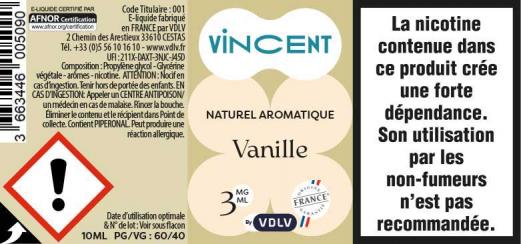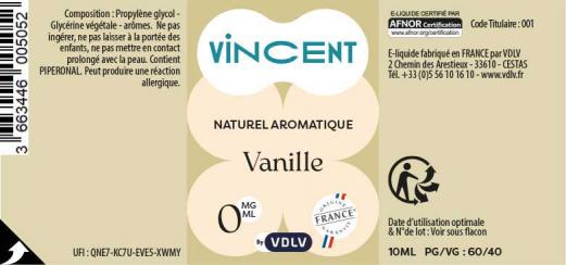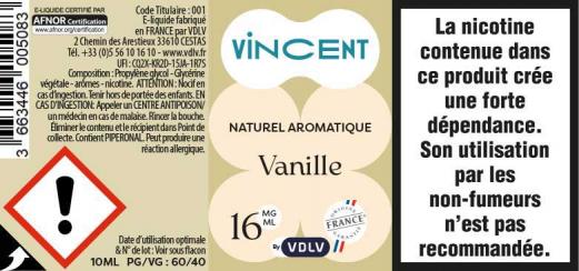Vanille est un e-liquide pour cigarette électronique, de la marque Vincent disponible en 0, 3, 6, 12 et 16mg/ml de nicotine et un taux de PG/VG de 60/40. Cette saveur est uniquement disponible en 10ml