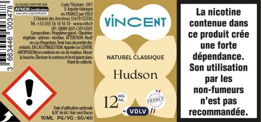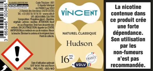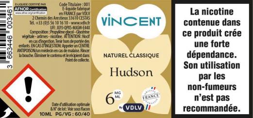 Hudson est un e-liquide pour cigarette électronique, de la marque Vincent disponible en 0, 3, 6, 12 et 16mg/ml de nicotine et un taux de PG/VG de 60/40. Cette saveur est uniquement disponible en 10ml