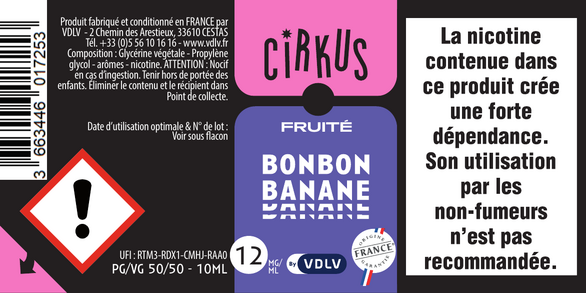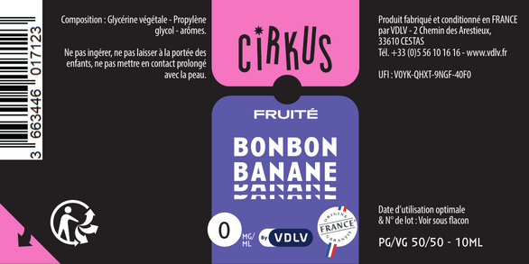 Bonbon Banane est un e-liquide pour cigarette électronique, de la marque Cirkus disponible en 0, 3, 6, 12 et 16mg/ml de nicotine et un taux de PG/VG de 50/50. Cette saveur est uniquement disponible en 10ml.