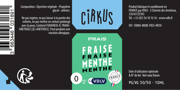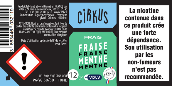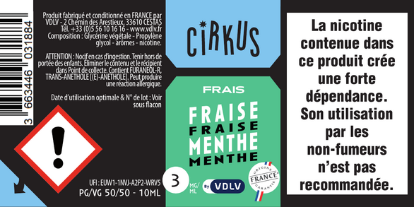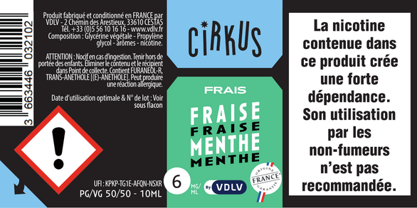 Fraise Menthe est un e-liquide pour cigarette électronique, de la marque Cirkus disponible en 0, 3, 6, 12 et 16mg/ml de nicotine et un taux de PG/VG de 50/50. Cette saveur est disponible en 10ml et en 50ml à booster.