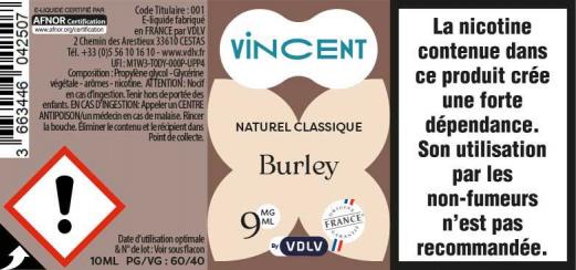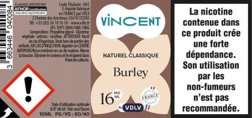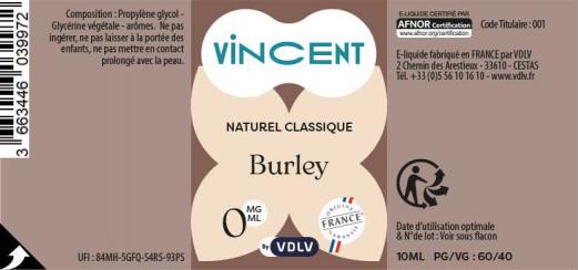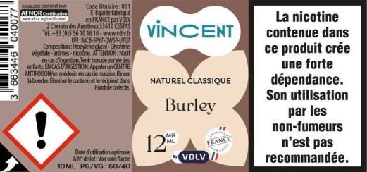 Classique Burley est un e-liquide pour cigarette électronique, de la marque Vincent disponible en 0, 3, 6, 12 et 16mg/ml de nicotine et un taux de PG/VG de 60/40. Cette saveur est uniquement disponible en 10ml
