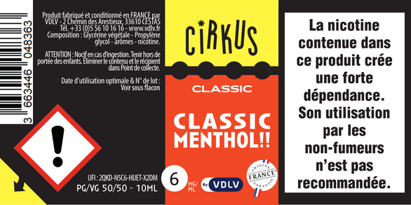 Classic Menthol est un e-liquide pour cigarette électronique, de la marque Cirkus disponible en 0, 3, 6, 12 et 16mg/ml de nicotine et un taux de PG/VG de 50/50. Cette saveur est disponible en 10ml et 50ml à booster.