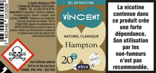 L'étiquetage : conformément à la législation européenne, chaque flacon présente un étiquetage personnalisé mentionnant le dessin et le nom de la saveur, la composition du e-liquide, le taux de nicotine, le nom, l'adresse et le site e-commerce de la société, la date limite d'utilisation et le numéro de lot. Pour les e-liquides nicotinés, un pictogramme réglementaire, des conseils de prudence ainsi qu'un triangle tactile "danger" pour les personnes malvoyantes sont placés sur l'étiquette du flacon.