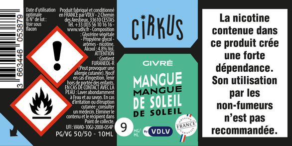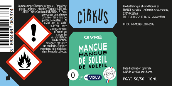 L'étiquetage : conformément à la législation européenne, chaque flacon présente un étiquetage personnalisé mentionnant le dessin et le nom de la saveur, la composition du e-liquide, le taux de nicotine, le nom, l'adresse et le site e-commerce de la société, la date limite d'utilisation et le numéro de lot. Pour les e-liquides nicotinés, un pictogramme réglementaire, des conseils de prudence ainsi qu'un triangle tactile "danger" pour les personnes malvoyantes sont placés sur l'étiquette du flacon.