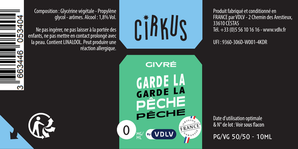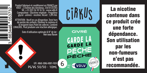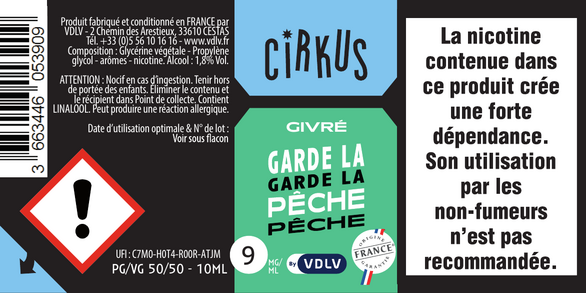 L'étiquetage : conformément à la législation européenne, chaque flacon présente un étiquetage personnalisé mentionnant le dessin et le nom de la saveur, la composition du e-liquide, le taux de nicotine, le nom, l'adresse et le site e-commerce de la société, la date limite d'utilisation et le numéro de lot. Pour les e-liquides nicotinés, un pictogramme réglementaire, des conseils de prudence ainsi qu'un triangle tactile "danger" pour les personnes malvoyantes sont placés sur l'étiquette du flacon.
