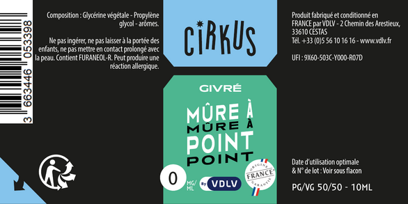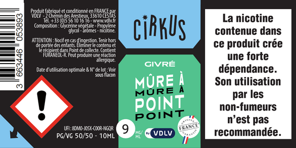 L'étiquetage : conformément à la législation européenne, chaque flacon présente un étiquetage personnalisé mentionnant le dessin et le nom de la saveur, la composition du e-liquide, le taux de nicotine, le nom, l'adresse et le site e-commerce de la société, la date limite d'utilisation et le numéro de lot. Pour les e-liquides nicotinés, un pictogramme réglementaire, des conseils de prudence ainsi qu'un triangle tactile "danger" pour les personnes malvoyantes sont placés sur l'étiquette du flacon.