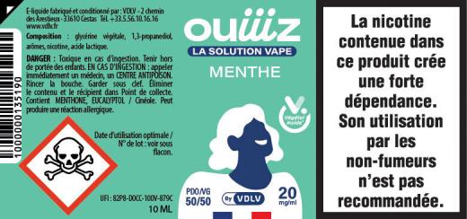 Enfin le dessin et le nom de la saveur, la composition du e-liquide, le taux de nicotine, le taux de PG/VG, le contenu (en ml), le code UFI (code relié à la déclaration de ce produit au Centre Antipoison Européen), à la date d'utilisation optimale et le numéro de Lot.
