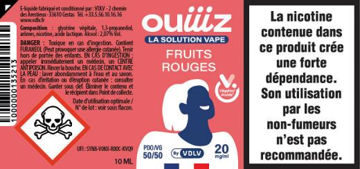 Enfin le dessin et le nom de la saveur, la composition du e-liquide, le taux de nicotine, le taux de PG/VG, le contenu (en ml), le code UFI (code relié à la déclaration de ce produit au Centre Antipoison Européen), à la date d'utilisation optimale et le numéro de Lot.
